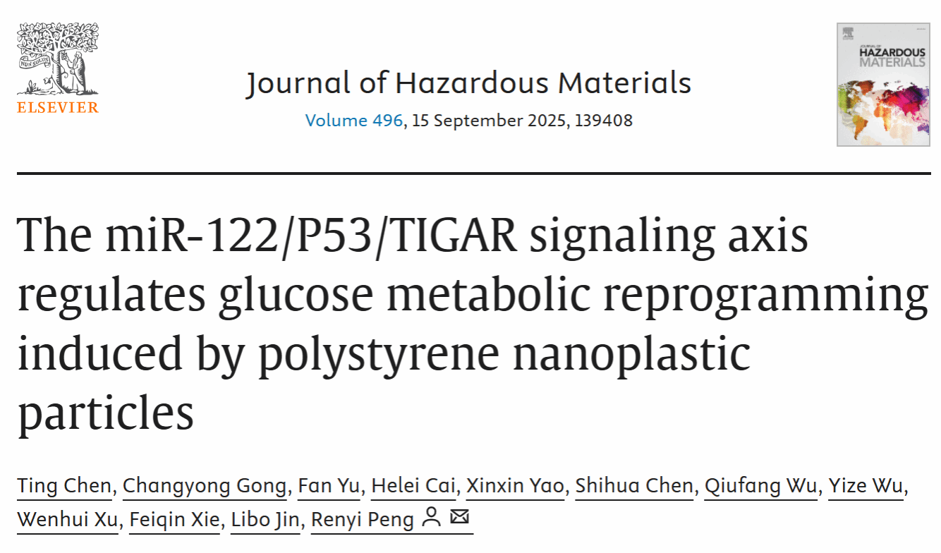 近日,日本a片 生命与环境科学学院彭仁义课题组在中科院一区期刊《Journal of Hazardous Materials》(IF=11.3)发表了题为“The miRNA-122/P53/TIGAR signaling axis regulates glucose metabolic reprogramming induced by polystyrene nanoplastic particles”最新研究。该研究聚焦聚苯乙烯纳米塑料(PS-NPs)污染这一全球性威胁,深入探究其通过靶向miRNA-122对糖代谢重编程的复杂影响机制。