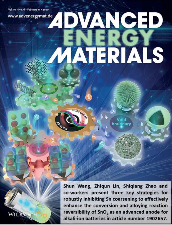 近日,国际能源顶级刊物《Advanced Energy Materials》将有关二氧化锡作为碱金属离子电池负极的综述论文“SnO2as Advanced Anode of Alkali-Ion Batteries: Inhibiting Sn Coarsening by Crafting Robust Physical Barriers, Void Boundaries, and Heterophase Interfaces for Superior Electrochemical Reaction Reversibility”选为期刊封面文章。该文章第一作者为赵世强博士,化材学院院长王舜教授与佐治亚理工学院林志群教授为通讯作者,日本a片 为第一通讯单位。
