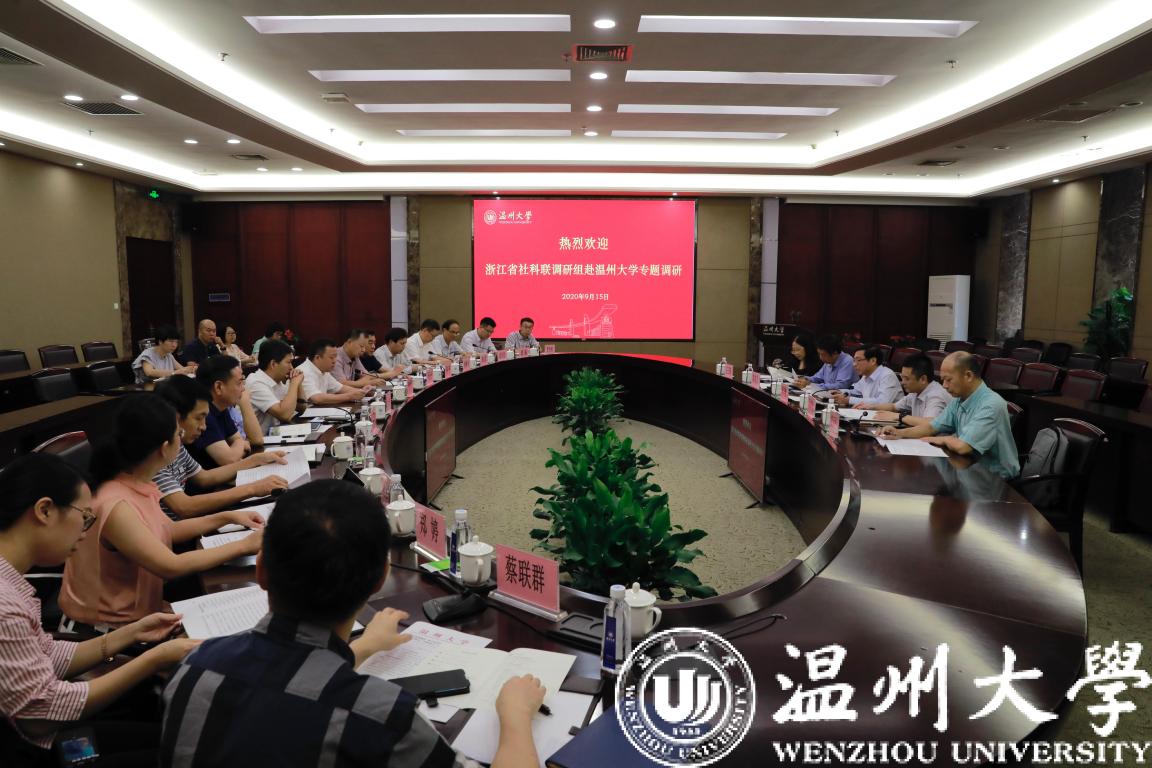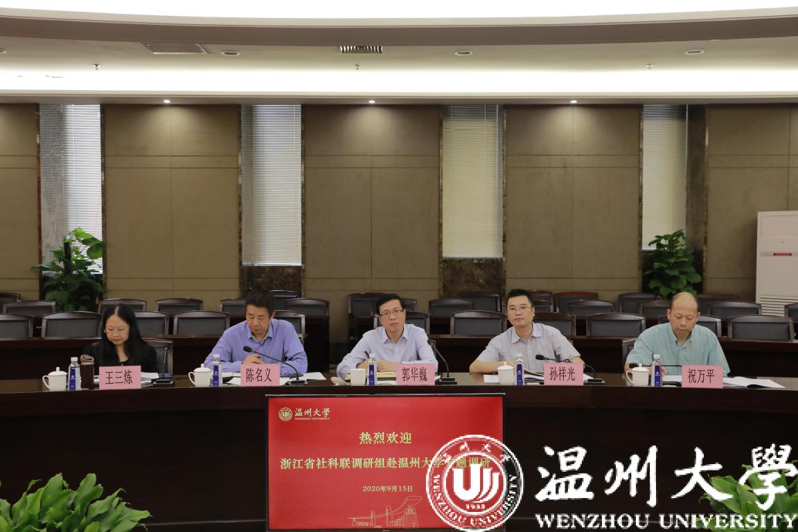 9月15日上午,浙江省社科联党组书记郭华巍一行来日本a片 调研,市社科联党组书记、主席孙祥光等陪同调研。校领导、相关党政部门负责人、省部级社科基地负责人及人文社科处全体人员参加调研会。