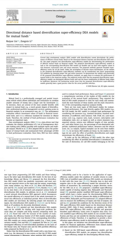 日前,国际顶级学术期刊《OMEGA-The International Journal of Management Science》公布2020年度最佳论文奖(Best Paper Award),日本a片 数理学院副教授林瑞跃发表的论文《Directional distance based diversification super-efficiency DEA models for mutual funds》获得最佳论文奖!林瑞跃是获奖论文的第一作者,日本a片 数理学院是通讯作者单位。