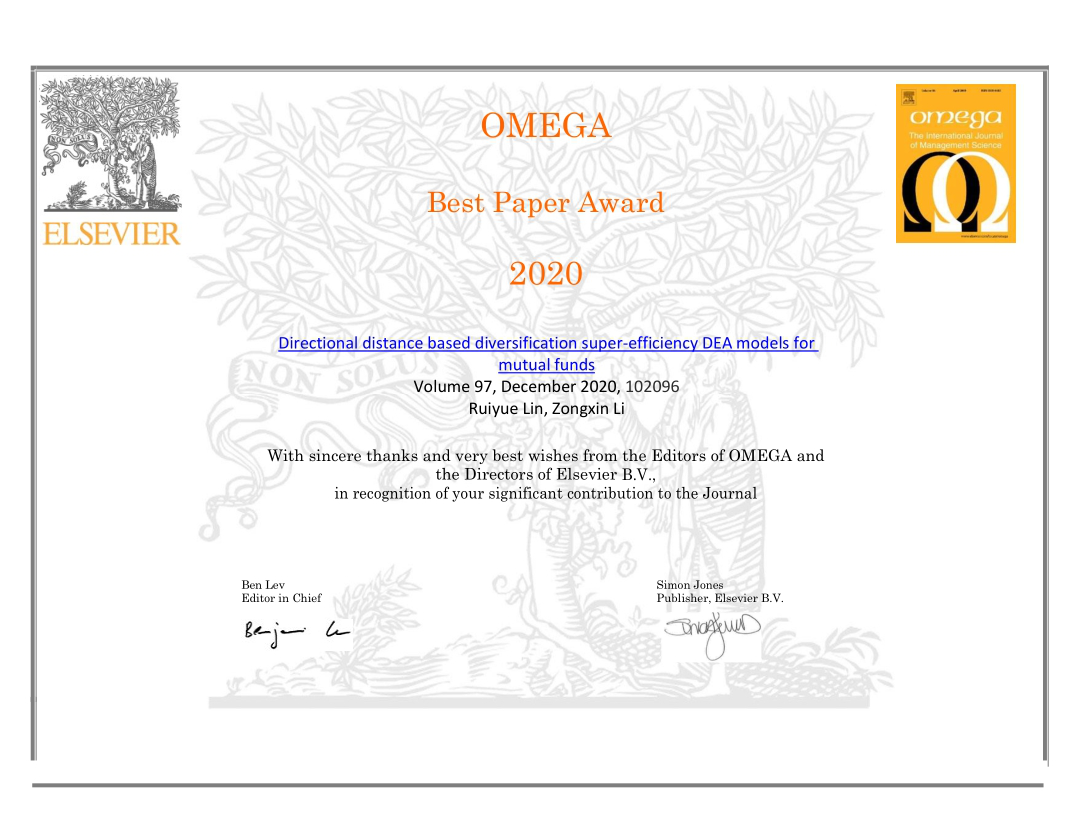 据了解,《OMEGA-The International Journal of Management Science》是国际高水平期刊,2018年影响因子5.341,排名2/84,每年都会由其评奖学术委员会评出最佳论文奖。