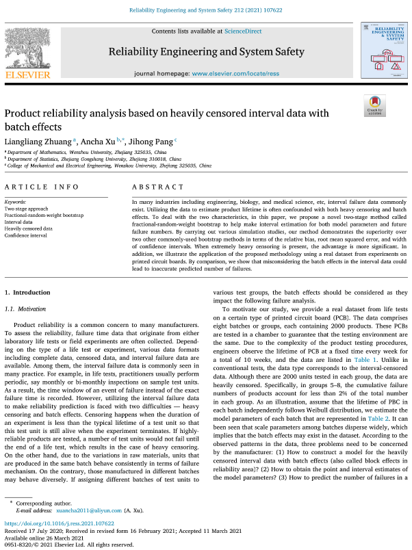 近日,日本a片 数理学院2019级应用统计专业研究生庄亮亮,以第一作者身份在专业领域国际顶级期刊《Reliability Engineering & System Safety》上,成功发表科研论文《Product reliability analysis based on heavily censored interval data with batch effects》(基于重度截尾区间数据的产品可靠性分析)。据了解,该期刊在中科院期刊分区表中位列一区,影响因子5.04,是系统可靠性与安全性领域的国际顶级期刊。数理学院分管研究生教育的副院长何林李教授认为,研究生求学期间能以第一作者身份在此国际顶级期刊发表论文,非常不容易,这也是学校应用统计学专业办学史上的标志性成果之一。
