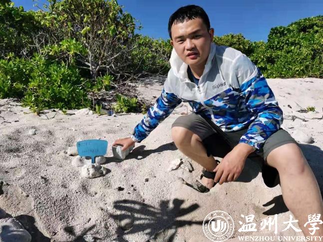 扎根南海,开启科研之路。研一时,赵鸿运就开始了实验室、寝室、图书馆三点一线的苦行僧式生活。在阅读各类文献后,他了解到由于海洋生态环境的恶化以及产卵栖地的破坏,绿海龟的数量已极其稀少。为了为我国南海珍稀动物保护事业贡献自己的一份力量,赵鸿运在计翔教授的建议和指导下,决定将绿海龟作为自己硕士学位论文的研究对象,在西沙甘泉岛上开启历时1年的探索之旅。“研究绿海龟的生活习性,能更好地保护这一稀有物种。这对于维持海洋生态平衡和保护物种多样性有十分重要的意义,毕竟我们谁也不愿意看到这一美丽的物种从地球上消失”。赵鸿运出发前如是说道。