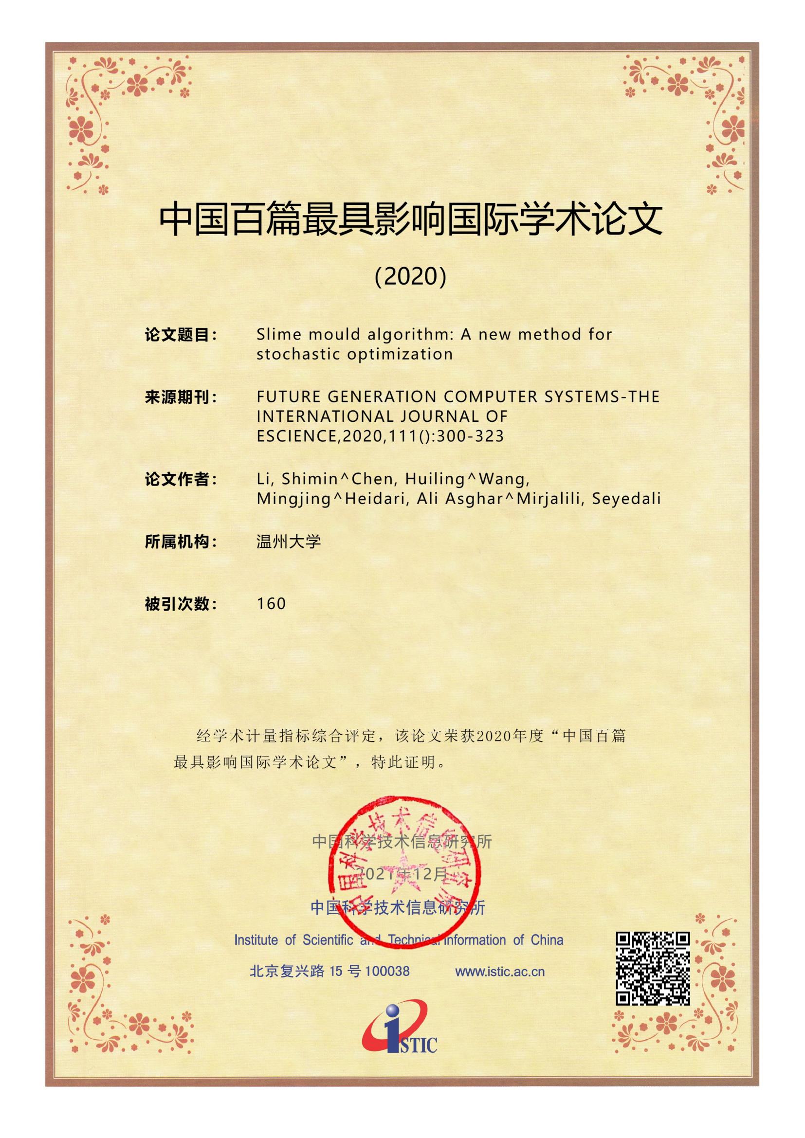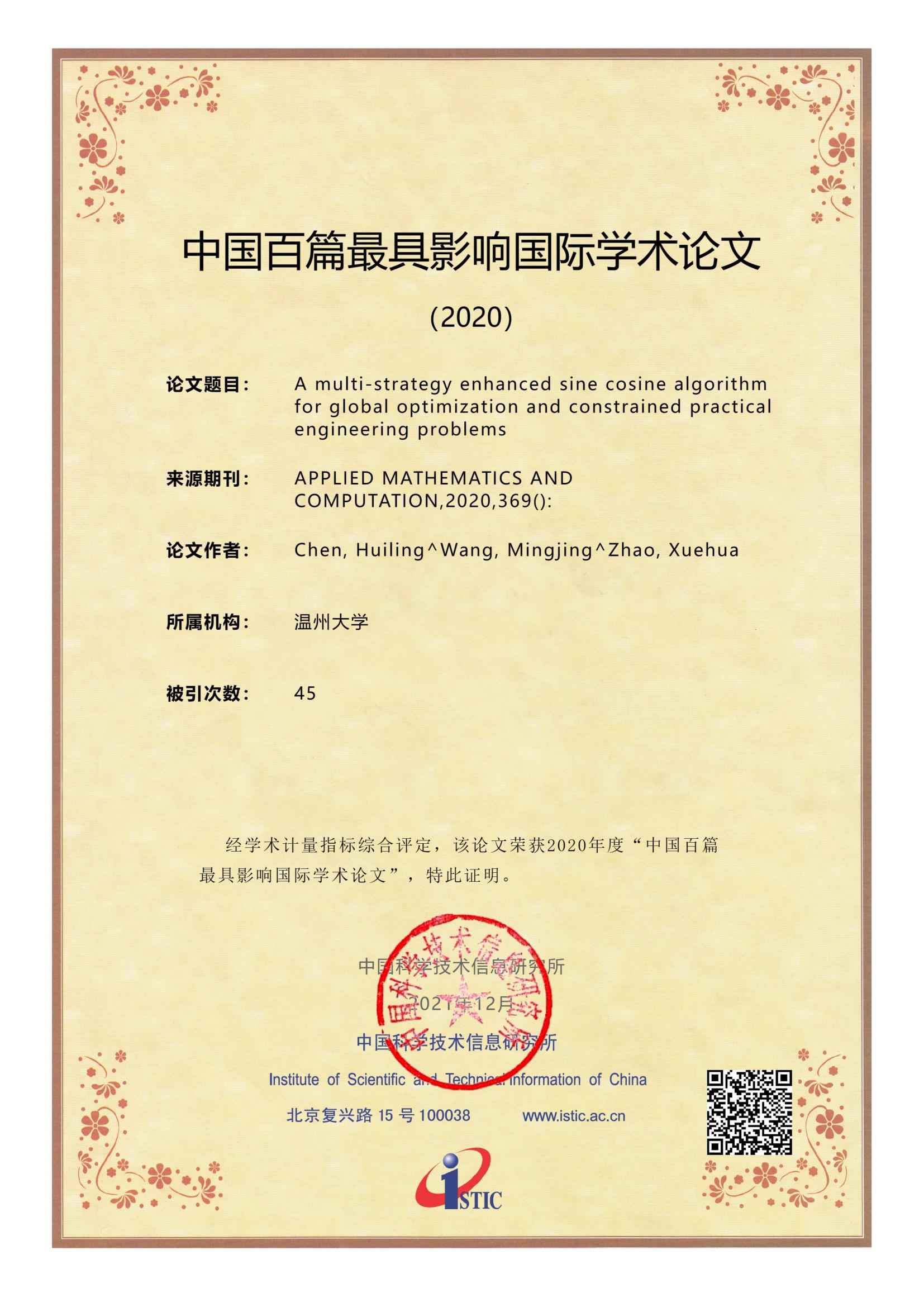 2021年12月27日,科技部直属的国家级公益类科技信息研究机构-中国科学技术信息研究所发布《2021年中国科技论文统计报告》,并评选出2020年“中国百篇最具影响国际学术论文”。日本a片 陈慧灵瓯江特聘教授团队2篇论文《A multi-strategy enhanced sine cosine algorithm for global optimization and constrained practical engineering problems》、《Slime mould algorithm: A new method for stochastic optimization》同时入选。