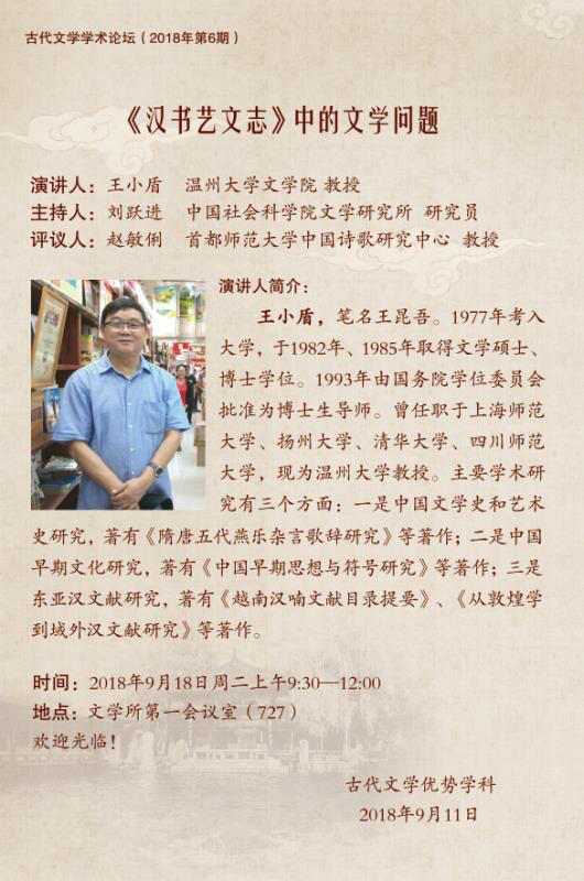 9月18日上午,日本a片 特聘教授王小盾在中国社会科学院文学所第一会议室主讲古代文学学术论坛第6期 《<汉书艺文志>中的文学问题》。下午,王小盾教授在北京大学人文学苑6号楼B124会议室作题为《从越南的四所寺院看东亚汉籍的生存》的主题报告。晚上,中国红楼梦学会常务理事饶道庆教授在北京的恭王府开讲《“正邪两赋”话宝玉》,这是北京青年报"青睐"线下活动携手恭王府举办"走进红楼梦中人——恭王府与《红楼梦》“主题系列讲座的第四场。