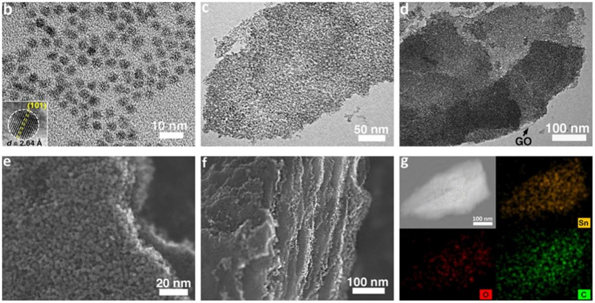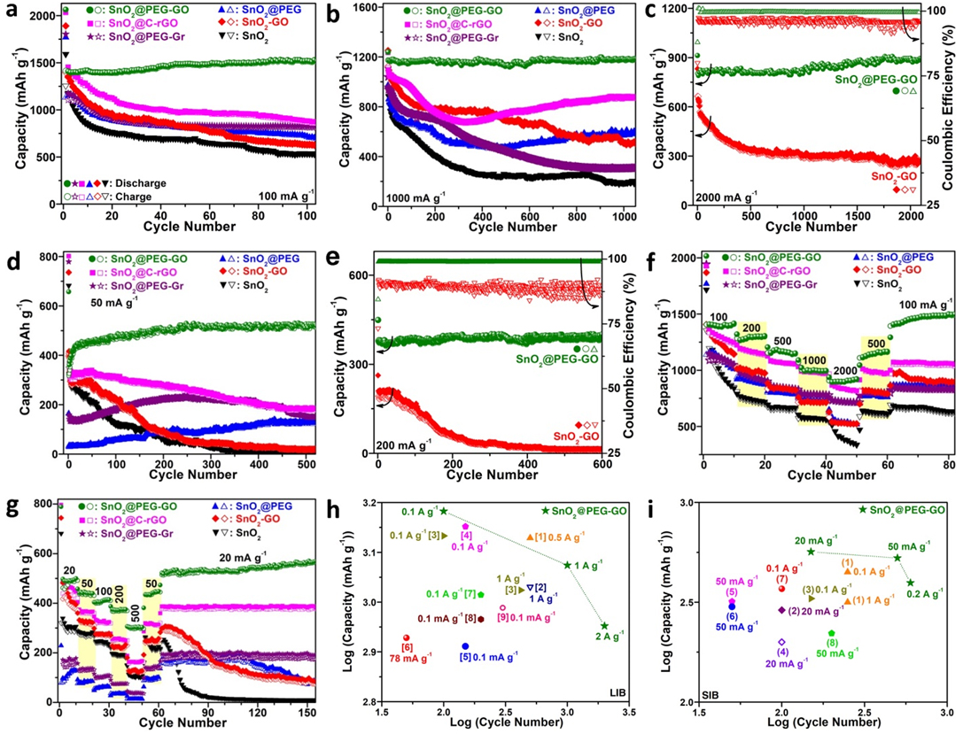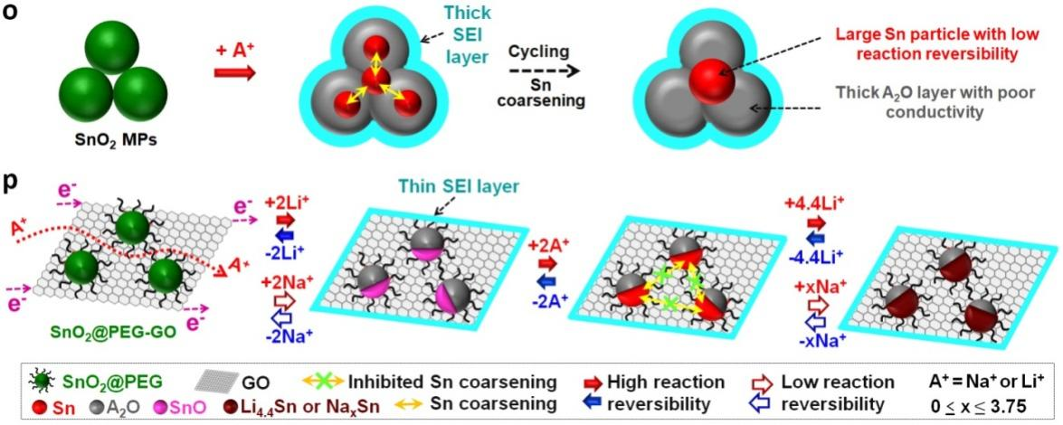 在本文工作中,研究团队基于前期发表的论文Advanced Energy Materials,2020,10,2070027(赵世强副教授为第一作者)中提出的抑制Sn粗化的“物理屏障、孔隙边界、异质界面”三种策略,创造性地以聚丙烯酸-嵌段-聚乙二醇(star-like PAA-b-PEG)星型嵌段共聚物为限域纳米反应器,实现了4纳米均一粒径SnO2颗粒的精准合成。利用颗粒表面接枝的PEG与氧化石墨烯(GO)上羟基、环氧基、羧基等功能基团间的氢键作用,将SnO2@PEG纳米颗粒均匀锚嵌在GO表面,经逐层堆叠后获得SnO2@PEG-GO层状复合材料。研究证实,纳米尺度SnO2具有超高储锂储钠电化学反应活性,PEG和GO分别作为离子和电子导体显著提升导电性,且PEG和GO分别作为纳米和微米层级的物理屏障高效抑制Sn粗化,使SnO2@PEG-GO展现出超高容量和杰出循环性能。值得关注的是,该工作利用高分辨电子显微镜、X射线光电子能谱、Raman散射光谱等系列表征手段,详细阐述了SnO2的三步可逆储锂反应过程,并首次证实了SnO2的储钠过程主要依赖于SnO和Sn之间的可逆电化学反应。该研究成果将对新型高容量电极材料的设计合成和储能机理研究具有一定借鉴意义。