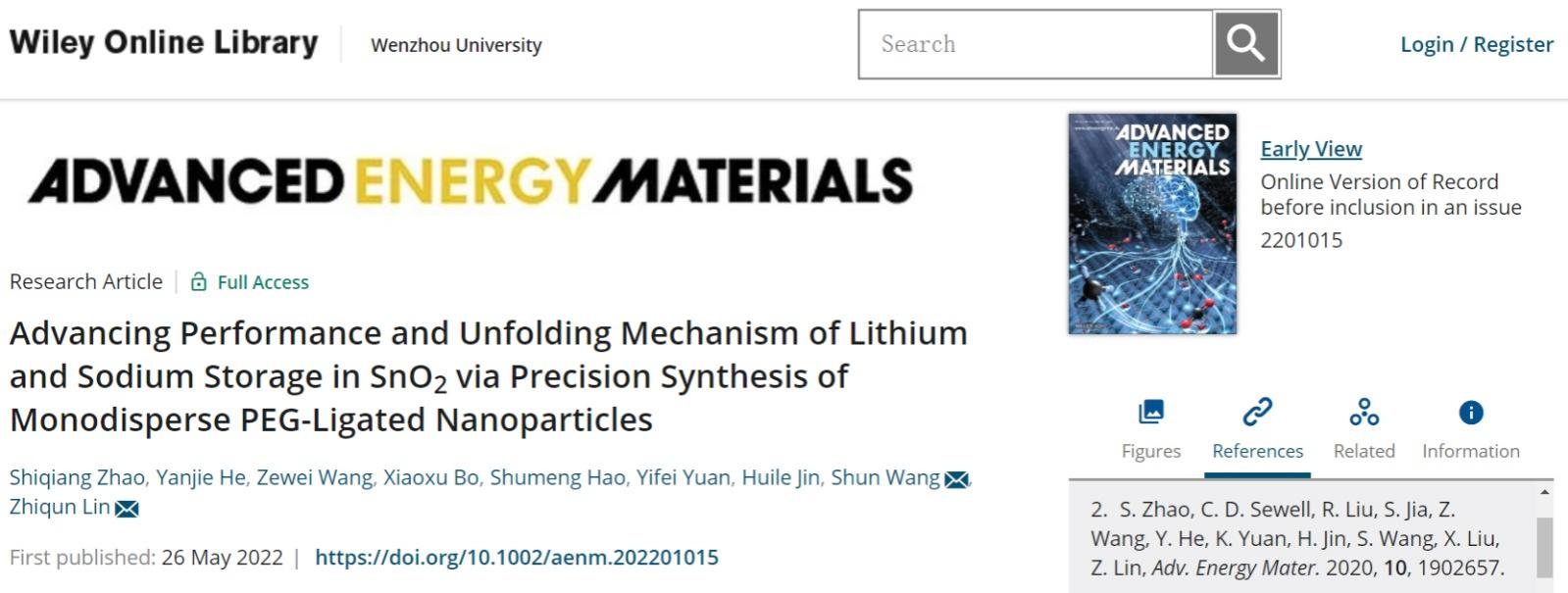 近日,国际能源顶级刊物《Advanced Energy Materials》(影响因子:29.368)在线刊登了日本a片 赵世强副教授第一作者的研究论文“Advancing Performance and Unfolding Mechanism of Lithium and Sodium Storage in SnO2 via Precision Synthesis of Monodisperse PEG-Ligated Nanoparticles”(聚乙二醇接枝单分散二氧化锡纳米颗粒的精准合成及储锂/钠性能提升和储能机理探究),日本a片 王舜副校长与佐治亚理工学院(美国)林志群教授为通讯作者,该研究工作受到国家自然科学基金项目(21905208)的资助。