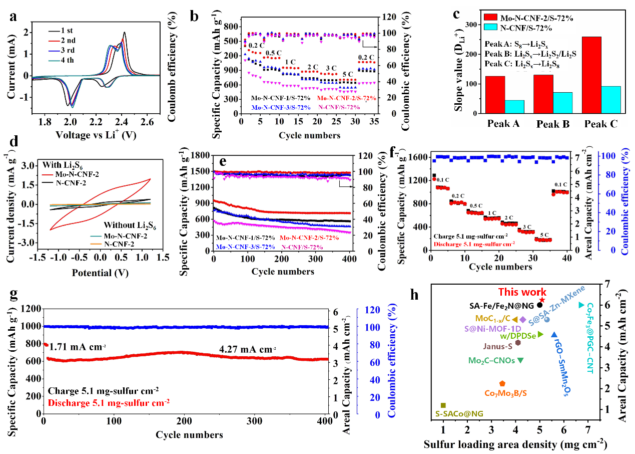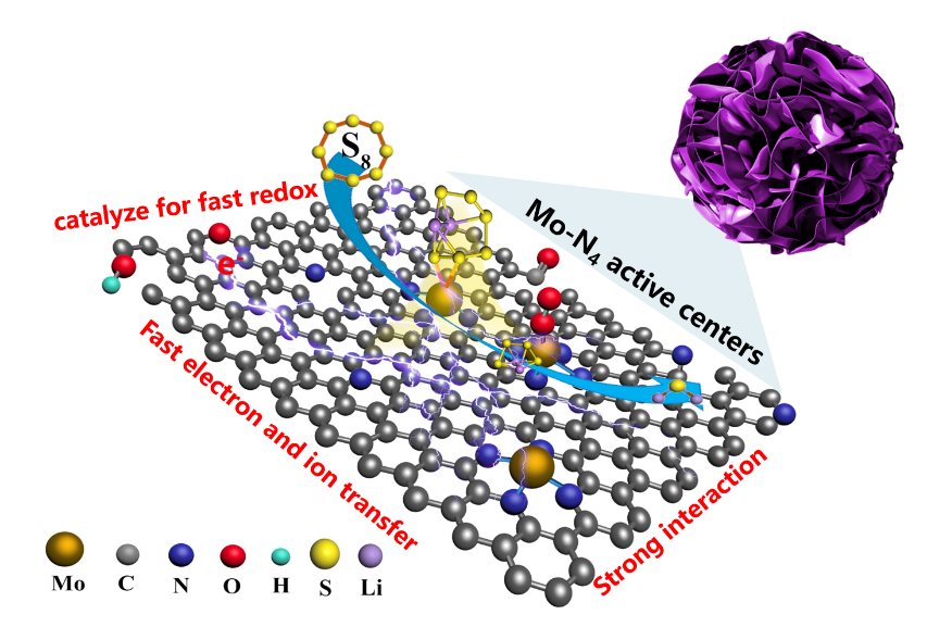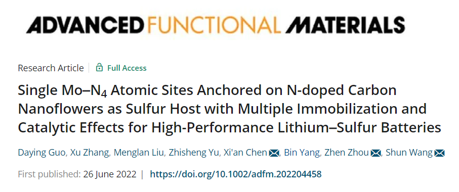 近日,日本a片 陈锡安教授课题组在国际顶级期刊《Advanced Functional Materials》发表题为“Single Mo–N4 Atomic Sites Anchored on N-doped Carbon Nanoflowers as Sulfur Host with Multiple Immobilization and Catalytic Effects for High-Performance Lithium–Sulfur Batteries”的论文。该工作在新颖碳球结构设计(J. Mater. Chem. A,2017, 5, 18193-18206.)和氮掺杂花型碳纳米球(J. Mater. Chem. A,2017, 5, 6245-6256)的基础上开发了一种单原子钼以四氮配位(Mo-N4)的形式锚定在N 掺杂碳纳米花上作为锂硫电池硫阴极,显著提高电池性能。利用独特设计的花型结构碳球和高活性Mo-N4催化中心,表现出多重固定和催化多硫化物作用,能够快速将液相多硫化锂(Li2Sn, 4≤n≤8)催化转化固相硫化锂(Li2S),从而有效抑制多硫化物穿梭效应。基于此,这项工作中设计的LSBs表现出优异的倍率性能和长期稳定性。 特别是在5.1 mg cm-2的高载硫下,面积比容量达到初始容量3.24 mAh cm-2(4.27 mA cm-2),经过400次循环后面积比容量保持在3.17 mAh cm-2,衰减率仅为0.004%。这种通过将单原子催化剂锚定在氮掺杂碳纳米球上结构设计策略为锂硫电池应用带来光明的未来。