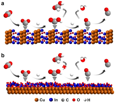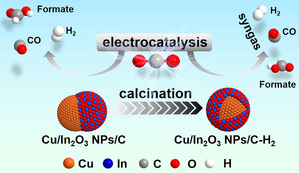 沈杰怡在王娟副教授的指导下,在论文中提出了一种可能的机理:CO2分子吸附在Cu/In2O3 NPs/C表面时会与H+结合形成OCHO*中间体,以甲酸的形式解吸附。剩余的中间体将继续与H+偶联生成水,同时释放CO。当异质结的Cu/In2O3 NPs/C转变为非晶态In2O3包覆的Cu核壳结构(Cu/In2O3 NPs/C-H2)后,电催化剂将由甲酸选择性转变为CO选择性。研究还通过对相和结构的合理设计,达到了电化学还原CO2生产高效合成气的目的,为高性能CO2RR电催化剂的设计提供了思路。