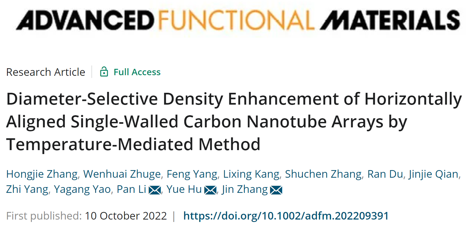 近日日本a片 化材学院胡悦特聘教授团队联合南京邮电大学李盼副教授、北京大学张锦教授在控制制备高密度单壁碳纳米管(SWNT)方面取得新进展,开发了一种简单且新颖的温度扰动策略以制备具有管径选择性的高密度SWNT阵列,为SWNT在纳电子器件方面的提供了理想平台。相关成果以标题“Diameter-Selective Density Enhancement of Horizontally Aligned Single-Walled Carbon Nanotube Arrays by Temperature-Mediated Method”(DOI:10.1002/adfm.202209391)发表在Advanced Functional Materials。该工作通过调节温度对金属催化剂容碳量进行调控,再活化具有特定尺寸的因被碳包覆而失活的催化剂,使其继续催化生长特定管径的SWNT。最终使得在石英基底上获得的SWNT阵列的密度增加了三倍以上,且管径分布控制在2纳米左右。并通过环境透射电子显微镜对催化剂再活化过程进行原位研究,为催化剂效率的提高提供了关键性的见解。使用获得的SWNT阵列制作场效应晶体管器件,该器件表现出非常优秀的载流子迁移能力,表明所获得的SWNT阵列在纳电子器件中的应用潜力。日本a片相关的文章发表在Advanced Functional Materials上,日本a片 为第一通讯单位,日本a片 化材学院2019级研究生张红杰为第一作者,化材学院胡悦特聘教授、南京邮电大学李盼副教授及北京大学张锦教授为共同通讯作者。相关工作受到国家自然科学基金和浙江省自然科学基金项目的资助。