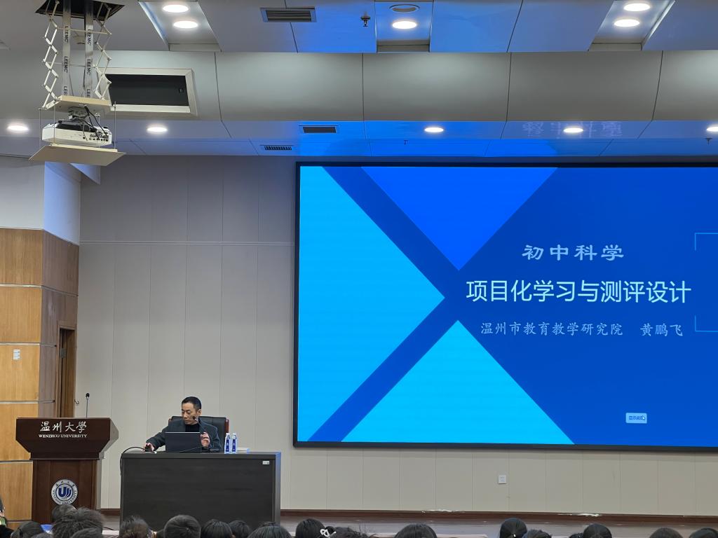 黄鹏飞题为《初中科学项目化学习与测评设计》的讲座通过“科学项目化学习的设计”及“科学项目化学习的测评设计”两大方面展开,强调科学项目化有利于促进学生的深度学习、发展学生的核心素养、提升教师的关键能力。黄老师从项目化学习的八大黄金原则、学科项目化学习的关键要素让学生形成基本了解,基于《碳中和理念设计低碳行动方案》及《节能房墙体砖的选择的案例》的案例对科学项目化学习的设计进一步阐释。此外,黄老师通过评价量表的设计、学业水平考试与期末考试、学生项目化学习挑战赛三方面对科学项目化学习的测评设计进行说明。