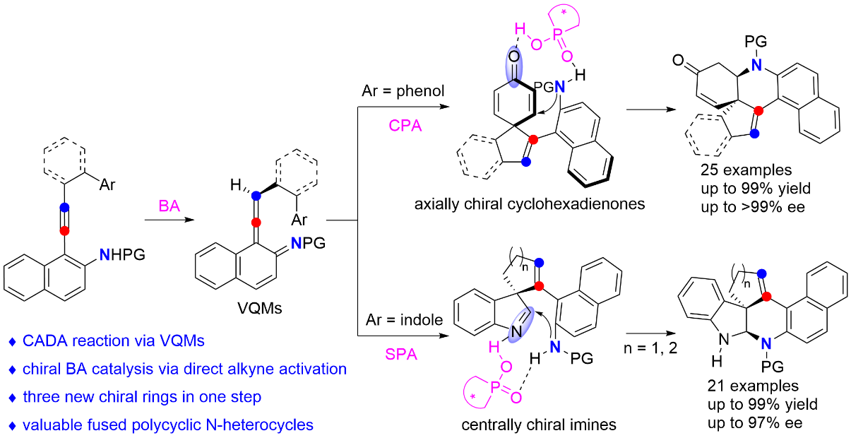 近些年来,通过活化惰性炔烃来实现炔烃催化不对称官能团化反应一直受到人们的广泛关注。与成熟的过渡金属催化这些转化相比,基于惰性炔烃活化的不对称有机催化发展相对较少。近日,日本a片 钱鹏程教授课题组与厦门大学叶龙武教授课题组合作以简单易得的苯酚高炔丙胺和吲哚高炔丙胺为底物,实现了Brønsted酸直接活化炔烃并成功完成苯酚和吲哚催化不对称去芳构化反应。该反应具有如下特点:(1)实现了Brønsted酸直接活化炔烃;(2)报道了无金属参与的基于苯酚和吲哚的不对称去芳构化反应;(3)一步构建具有季碳且多立体中心的含氮杂环;(4)具有优秀的化学选择性、对映选择性和立体选择性。