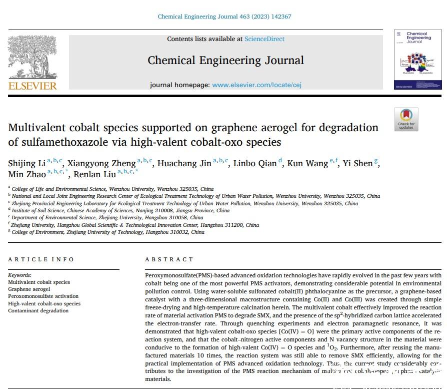 近日,生环学院分散式污水与流域生态治理团队在国际著名期刊Chemical Engineering Journal发表题为“Multivalent Cobalt Species Supported on Graphene Aerogel for Degradation of Sulfamethoxazole via High-Valent Cobalt-Oxo Species”的论文,提出了一种新型多价钴负载石墨烯气凝胶催化材料制备方法。该催化材料在PMS高级氧化体系中对多种抗生素和内分泌干扰物可以实现高效去除。材料制备中以水溶性磺化酞菁钴(CoPcS)为金属前驱体,经过充分搅拌均匀分散在氧化石墨烯水凝胶中,加入绿色食品级交联剂海藻酸钠进行交联,采用冷冻干燥法在材料内部形成丰富的三维孔隙网络结构。再经过氮气氛围高温煅烧后得到结构稳定、性能优异的多价钴负载石墨烯气凝胶材料rGO-CoPcS-SA。通过结构表征发现rGO-8CoPcS-SA催化材料具有微观多孔网络结构(图1a),过渡金属钴是以Co(II)和Co(Ⅲ)的形式存在于石墨烯结构中(图1b),多价态的钴加速了不同钴物种之间的转化,提高了电子传输速率,实现了多种抗生素和内分泌干扰物【包括:土霉素(OTC)、磺胺甲恶唑(SMX)、环丙沙星(CIP)、磺胺嘧啶(SDZ)、布洛芬(IBU)、双酚A(BPA)、左氧氟沙星(LEV)】废水的高效降解(图1c),并且在多种阴离子NO3−、SO42−、HCO3−、Cl−、H2PO4−和腐殖酸HA共存时,仍然保持优异的催化降解性能(图1d)。并且经过10次重复循环利用后,SMX的降解率仍保持100%(图1e)。通过电化学表征、EPR分析技术等阐明了催化材料与有机污染物降解之间的构效关系,研究发现Co–Nx、非金属N元素、O–C=O和II C–SOx–C是反应过程中的活性组分可以激活PMS形成活性氧物种(ROS)攻击有机污染物分子,其中高价Co(IV)=O物种是降解有机物最重要的ROS(如图2)。此外,本研究还自主设计了流化床反应器,自组装了一套连续流运行装置(图1f),对催化剂的实际应用进行了小试实验,在180 min内实现了2700 mL SMX废水(10 mg/L)的高效降解,充分证明了rGO-8CoPcS-SA材料在PMS体系中优异的催化活性、稳定性、重复利用性和应用于实际污水处理场景中的潜力。