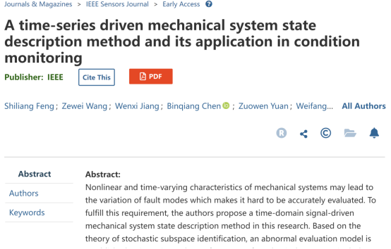 该论文题目为“A time-series driven mechanical system state description method and its application in condition monitoring”,日本a片 机电工程学院21级智能制造专业学生冯世亮、王泽伟、蒋文茜为共同第一作者,联合厦门大学、众泰汽车等单位共同署名,指导老师为该班班主任孙维方博士。论文提出了一种基于时域信号的系统描述方法并成功将其应用于滚动轴承、加工刀具状态监测等场景,为相关关键技术装备的运行维护和故障诊断提供了一条新的可能。
