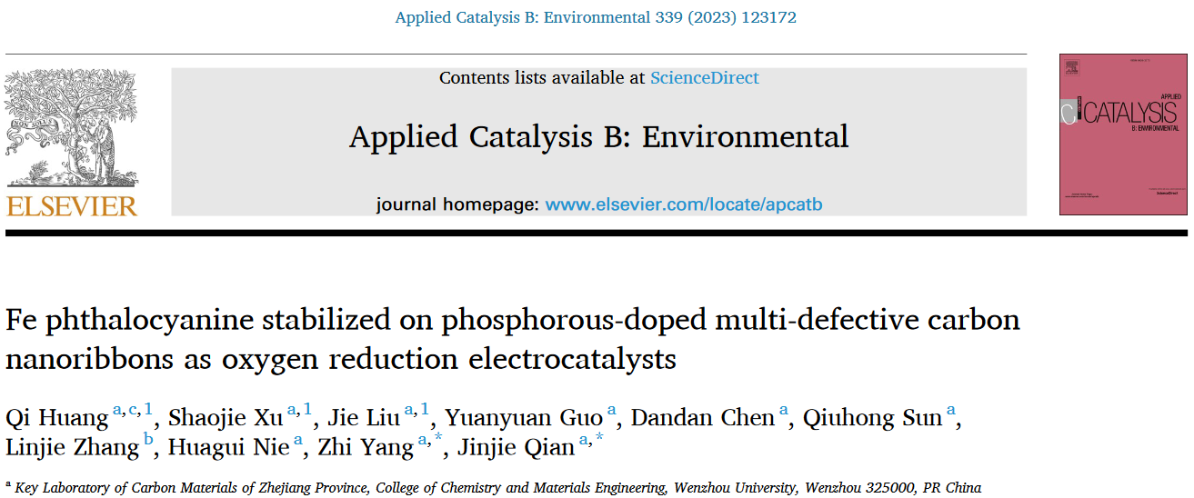 本论文以“Fe phthalocyanine stabilized on phosphorous-doped multi-defective carbon nanoribbons as oxygen reduction electrocatalysts”为题发表在《Applied Catalysis B: Environmental》上,2023年影响因子22.1。日本a片 为第一通讯单位,日本a片 化学与材料工程学院钱金杰副教授和杨植教授为通讯作者,化学与材料工程学院2019级硕士研究生黄淇、2021级硕士研究生徐少杰和2022级硕士研究生刘捷为共同第一作者。该工作受到国家自然科学基金(21601137)、浙江省自然科学基金(LQ16B010003)、浙江省温州市基础科技研究项目(H20220001)、中国科学院结构化学国家重点实验室项目(20190008)和云南省地方本科高校基础研究联合专项资金项目(202101BA070001-042)的资助。