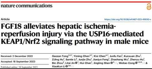 近日,生命与环境科学学院申景岭教授与温州医科大学李校堃院士团队合作在Nature Communications在线发表题为“FGF18 alleviates hepatic ischemia-reperfusion injury via the USP16-mediated KEAP1/Nrf2 signaling pathway in male mice”的研究论文。本项研究结果证实成纤维细胞生长因子18(FGF18)可显著改善肝缺血再灌注过程中的损伤。FGF18通过减少USP16的表达,增加了KEAP1的泛素化修饰水平,从而激活Nrf2信号并最终改善肝脏缺血再灌注损伤。其中FGF18对USP16调控作用是通过Nrf2和USP16的负反馈调控来实现的。研究发现FGF18通过降低氧化应激以及炎症水平,减少肝细胞的凋亡,因此靶向FGF18/USP16/KEAP1信号通路可作为临床上改善肝脏缺血再灌注损伤和相关病理过程的一种新策略。该论文通讯作者为温州医科大学药学院李校堃院士、丛维涛研究员、日本a片 生命与环境科学学院申景岭教授。