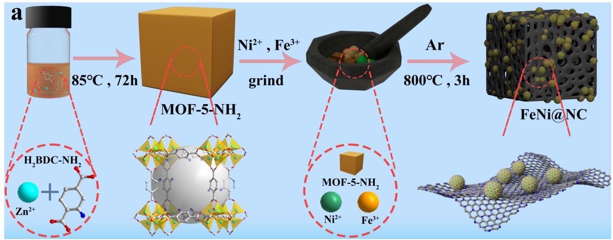 化石燃料的广泛使用已经导致了日益严重的环境污染问题。因此,替代能源的研究迫在眉睫。在这一背景下,氢能作为一种高能量密度的绿色能源备受关注。电解水提供了一种简便的方法用于生产纯氢。然而,阳极析氧反应(OER)的缓慢动力学限制了整个水裂解过程。商用贵金属氧化物,如IrO2和RuO2,被认为是优秀的OER催化剂,但其高昂的成本、稀缺性和低电导率限制了其广泛应用。因此,研发经济、丰富和高效的OER催化剂显得尤为重要。另一方面,金属有机框架(MOF)由金属单元与有机配体之间的强配位键构成。由于其具有高比表面积、丰富的孔隙结构和多样性的结构,MOF材料在制备具有出色OER催化性能的MOF衍生碳纳米材料方面展现了巨大的潜力。然而,由于Ni-MOF制备的OER催化剂存在活性不足和稳定性较差的问题,因此通过引入两种或多种过渡金属产生的协同效应,可以显著促进OER的电子转移,降低反应势垒,提高催化效率。此外,氮掺杂碳的包覆效应已被证明可以有效地防止催化剂的腐蚀,并表现出卓越的稳定性。我们期望通过合理的设计和合成策略,制备氮掺杂的双金属基MOF衍生碳纳米材料用于OER。这项研究为设计高效、低成本的非贵金属基电催化剂提供了合理的方案策略。