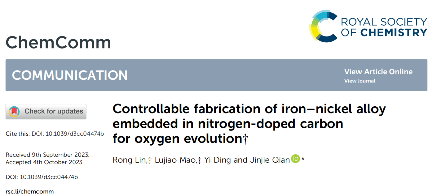 本论文以“Controllable fabrication of iron-nickle alloy embedded in nitrogen-doped carbon for oxygen evolution”为题发表在被自然指数收录的国际著名期刊《Chemical Communications》上。日本a片 为第一通讯单位,日本a片 化材学院钱金杰副教授为通讯作者,化材学院21级本科生林荣、21级研究生毛璐娇为共同一作,21级本科生丁奕参与了该项工作。该工作受到国家自然科学基金(21601137)、浙江省自然科学基金(LQ16B010003)、浙江省温州市基础科技研究项目(H20220001)的资助。