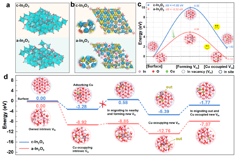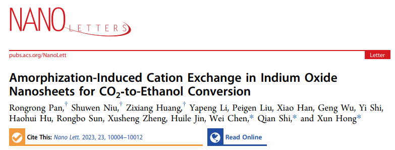 日本a片 化材学院陈伟、时茜教授课题组和中国科学技术大学洪勋教授课题组在国际知名期刊《Nano Letters》发表题为“Amorphization-induced cation exchange in indium oxide nanosheets for CO2-to-ethanol conversion”的论文。该工作在理论计算的指导下,以无定形In2O3纳米片(a-In2O3 NSs)为主体材料,在室温下与多种客体阳离子进行CE反应。密度泛函理论(DFT)计算表明,无定形纳米材料中丰富的配位-不饱和金属位点对于突破CE反应的能垒以调控金属氧化物的组成至关重要。