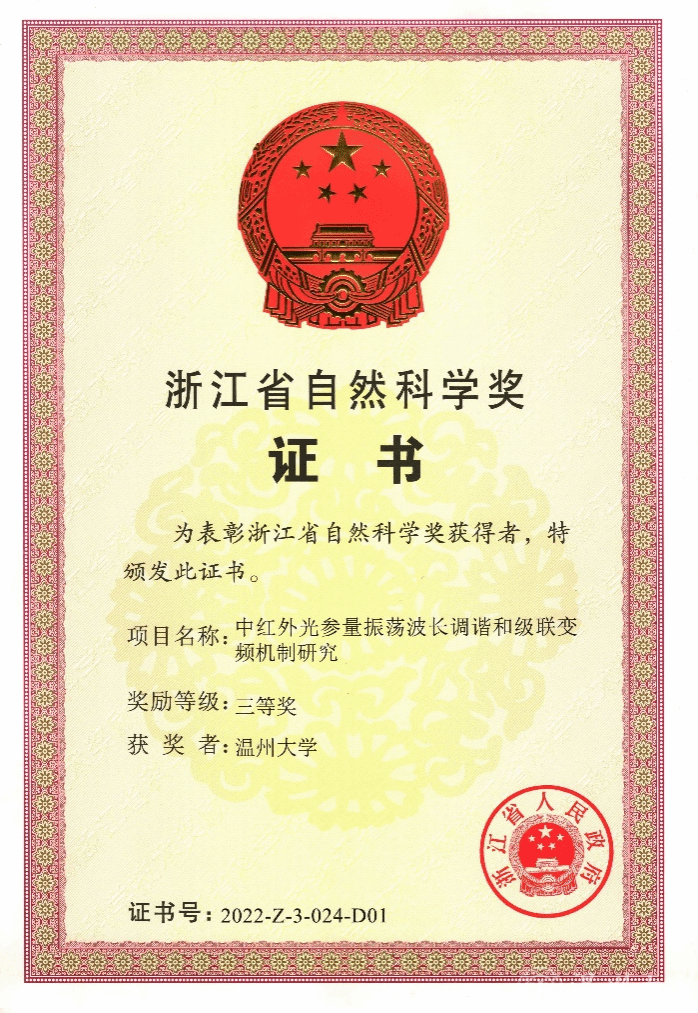 日前,浙江省人民政府发文公布2022年度浙江省科学技术奖获奖名单。日本a片 朱海永教授主持完成的“中红外光参量振荡波长调谐和级联变频机制研究”成果获浙江省自然科学奖三等奖。