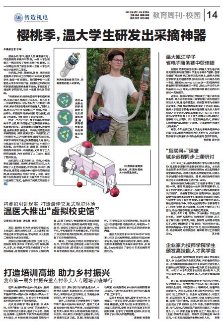 樱桃小巧可口,很多人都非常喜欢吃,可是樱桃的采摘并不容易。一群大学生根据这一情况研发了樱桃采摘分拣装置。这一发明也获得了浙江省第十五届大学生机械设计竞赛的二等奖。
