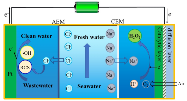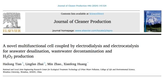 近日,日本a片 生命与环境科学学院黄先锋副教授带领的团队在国际著名期刊《Journal of Cleaner Production》(SCI 一区TOP 期刊,IF = 11.1)上发表题为“A novel multifunctional cell coupled by electrodialysis and electrocatalysis for seawater desalination, wastewater decontamination and H2O2 production”的论文。