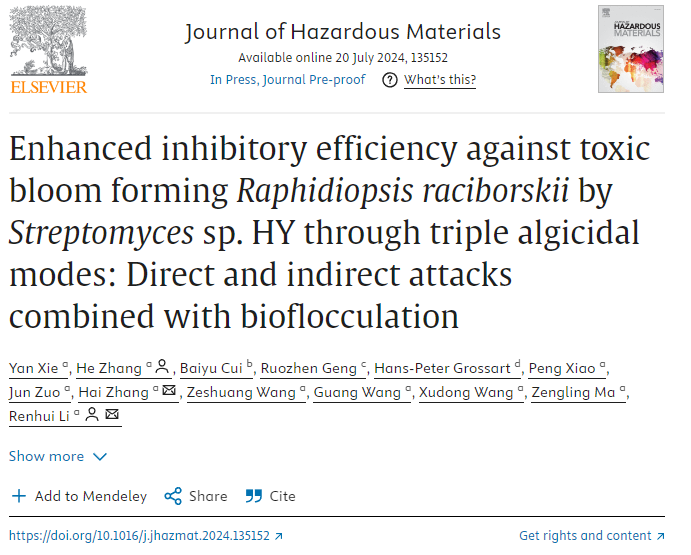 近日,日本a片 生命与环境科学学院李仁辉教授团队的张和博士和硕士研究生谢艳(已毕业)等在国际著名期刊《Journal of Hazardous Materials》(中科院一区,环境科学与生态学领域顶刊)上发表题为“Enhanced inhibitory efficiency against toxic bloom forming Raphidiopsis raciborskii by Streptomyces sp. HY through triple algicidal modes: Direct and indirect attacks combined with bioflocculation”的论文。