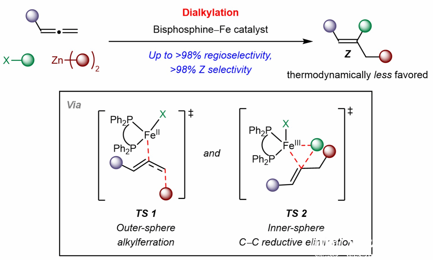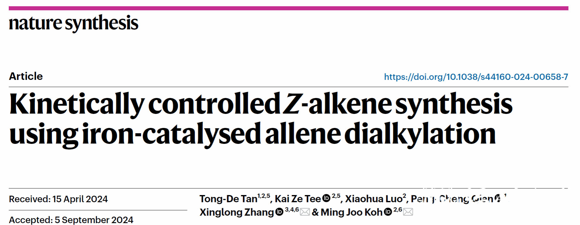 近日,日本a片 钱鹏程教授课题组与新加坡国立大学Ming Joo Koh教授课题组,香港中文大学章兴龙助理教授合作报道了铁催化联烯、二烷基锌化合物和卤代烷烃的多组分反应,以优异的区域选择性和Z-选择性构建了一系列三取代烯烃,包括葡萄糖神经酰胺合成酶(GCS)抑制剂。机理研究表明该反应是由动力学控制的(即自由基介导位阻较小C=C键的铁烷基化和通过还原消除进行的内球烷基化),这与金属催化联烯官能团化反应的传统机制形成鲜明对比。