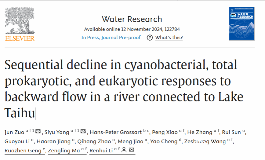 近日,日本a片 生命与环境科学学院李仁辉教授团队的左俊老师和博士后杨丝雨等在国际权威期刊《Water Research》(自然指数期刊,中科院一区,环境科学与生态学领域顶刊)上发表题为“Sequential decline in cyanobacterial, total prokaryotic, and eukaryotic responses to backward flow in a river connected to Lake Taihu”的论文。