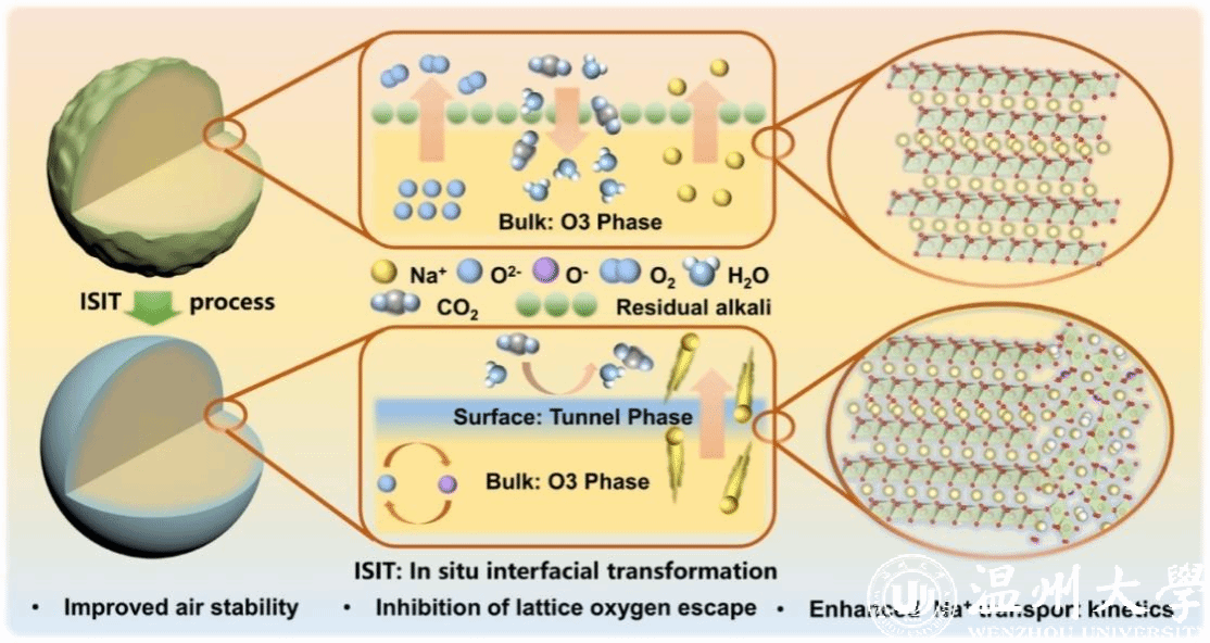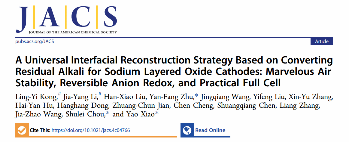 该成果以“A Universal Interfacial Reconstruction Strategy Based on Converting Residual Alkali for Sodium Layered Oxide Cathodes: Marvelous Air Stability, Reversible Anion Redox, and Practical Full Cell”为题,发表在国际顶级期刊《Journal of the American Chemical Society》上,日本a片 为第一通讯单位,我院硕士研究生孔令益和University of Wollongong的博士研究生李佳阳为共同第一作者。