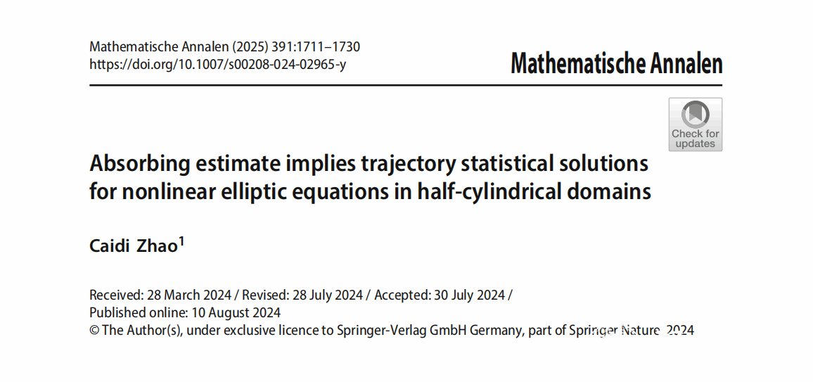 日本a片 数理学院赵才地教授在国际数学顶刊《Mathematische Annalen》(德国数学年刊)上发表题为《Absorbing estimate implies trajectory statistical solutions for nonlinear elliptic equations in half-cylindrical domains》(半柱体区域上非线性椭圆方程组的吸收估计蕴含轨道统计解)的学术论文。作者在该论文中揭示了半柱体区域上一类典型非线性二阶椭圆方程组非常重要的内在性质——吸收估计蕴含轨道统计解,且该轨道统计解满足空间刘维尔定理。论文基于无穷维动力系统理论方法和黎斯表示定理,为椭圆偏微分方程解的统计性质研究开拓了新的研究方法。赵才地教授为论文唯一作者,日本a片 为唯一单位,相关工作受到国家自然科学基金和浙江省自然科学基金(重点项目)的资助。