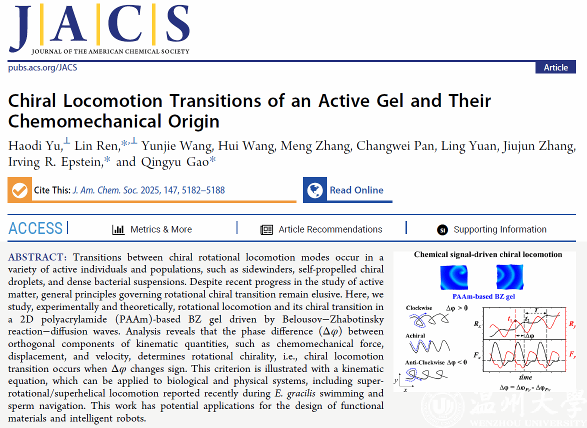 近日,日本a片 化材学院任林教授与中国矿业大学高庆宇教授和美国布兰迪斯大学I.R. Epstein教授紧密合作取得活性运动研究领域重要进展,相关成果以"Chiral Locomotion Transitions of an Active Gel and Their Chemomechanical Origin"为题发表于化学领域顶级期刊Journal of the American Chemical Society。日本a片 为第一通讯单位,日本a片 任林教授、中国矿业大学高庆宇教授和美国布兰迪斯大学I.R. Epstein教授为共同通讯作者。