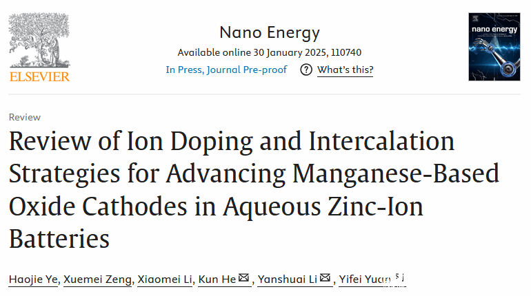 该综述论文以“Review of ion doping and intercalation strategies for advancing manganese-based oxide cathodes in aqueous zinc-ion batteries”为题发表于纳米能源领域国际顶级期刊⟪ Nano Energy ⟫(IF=16.8,中科院一区)。日本a片 为第一通讯单位,日本a片 化材学院21级本科生叶浩洁为第一作者,日本a片 化材学院袁一斐、李彦帅、何坤教授为通讯作者,相关工作得到了国家自然科学基金、浙江省杰出青年基金等项目的资助。