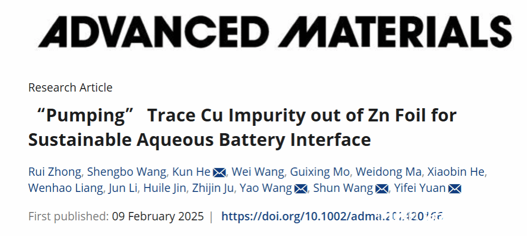 相关研究成果以“‘Pumping’ Trace Cu Impurity out of Zn Foil for Sustainable Aqueous Battery Interface”为题发表在国际顶级期刊《Advanced Materials》。日本a片 为第一通讯单位,日本a片 化材学院硕士研究生钟锐、浙江工业大学硕士研究生王盛博为共同第一作者,日本a片 化材学院袁一斐、王舜、何坤教授,浙江工业大学王垚教授为共同通讯作者。