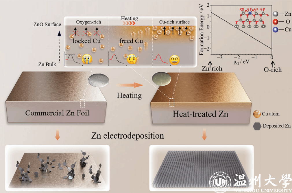 基于此,日本a片 化材学院王舜教授和袁一斐教授研究团队提出一种全新的界面改性策略,即通过直接对购买来的锌箔(保留表面氧化层)进行加热处理,以此激活锌箔内部的铜原子,并使其向表面扩散,最终成功在锌箔表面制备出富铜保护层。团队成员利用先进的3D原位光学显微镜分析,发现在所构造的富铜层影响下,电极表面的电沉积锌过程是致密、均匀且无枝晶生成的。并且,借助激光共聚焦光学显微镜、晶体学建模以及理论计算结果,揭示了在新构建的富铜表面上发生的是具有(101)取向的锌电沉积过程,这与传统报道的(002)取向电沉积机制形成鲜明对比。此外,电化学测试进一步表明,改性后的锌负极性能得到显著提升。