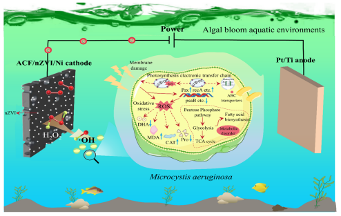 研究团队构建了基于铂钛阳极与活性炭纤维/纳米零价铁/泡沫镍阴极(ACF/nZVI/Ni)的电化学体系,通过非均相电芬顿反应高效生成羟基自由基(·OH)高效灭活铜绿微囊藻(Microcystis aeruginosa)等常见有害藻类。实验表明,电化学处理通过三重机制实现控藻(图2):