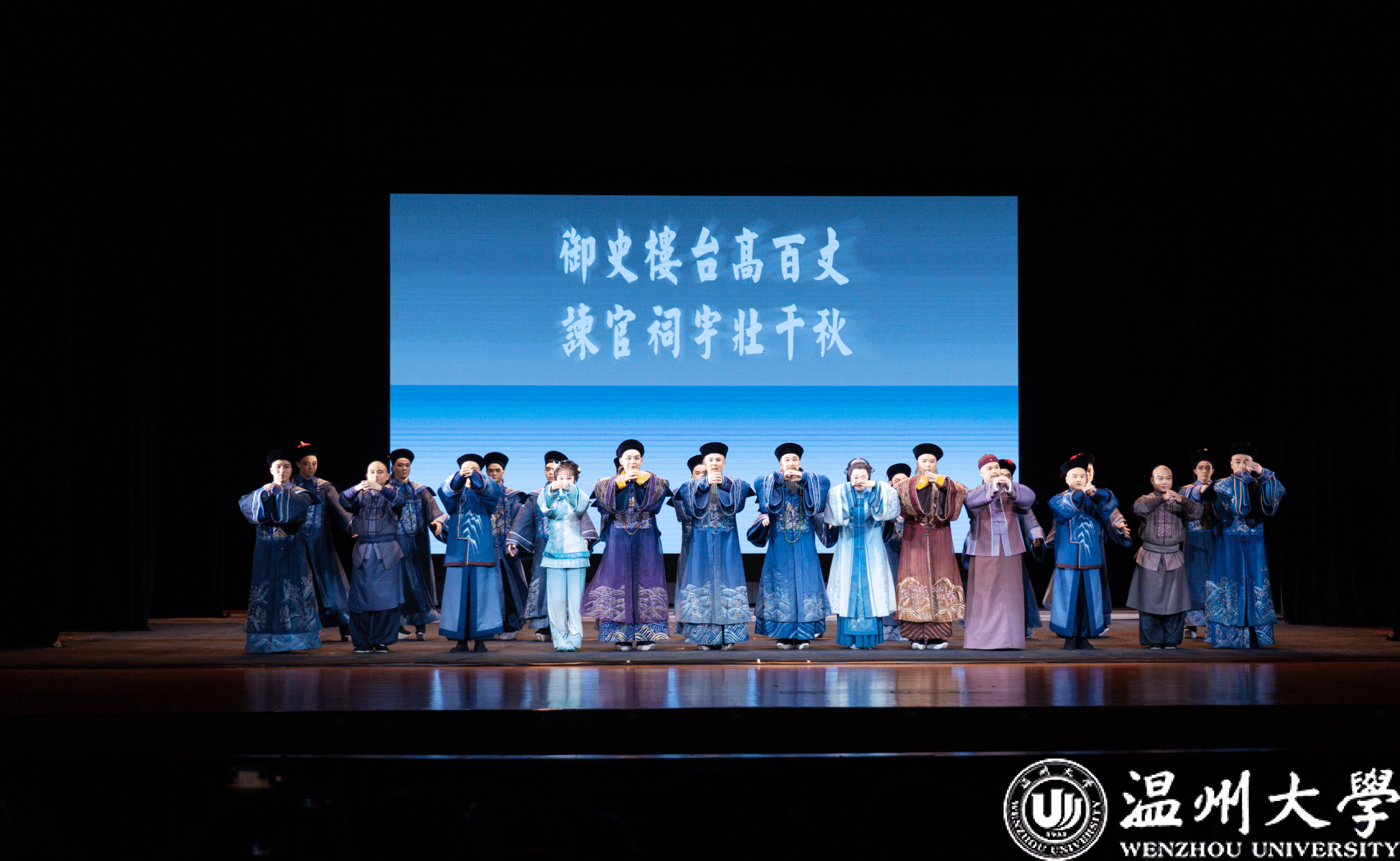 作为本届中国戏剧节展演剧目的重磅作品之一,《监察御史徐定超》以历史为镜,生动演绎了监察御史徐定超清正廉明、秉公执法的动人故事。该剧将温州的历史人文熔铸其中,以诗意与幽默并蓄的形式,展现严肃的除恶斗争,塑造了徐定超以治国平天下为己任的智慧士大夫形象,达到了雅俗共赏的艺术效果。其情节跌宕起伏,扣人心弦。演员们婉转的唱腔、优美的身段、细腻的情感表达,让师生沉浸在剧情之中,仿佛穿越时空,亲眼见证徐定超的铁面无私与家国情怀。