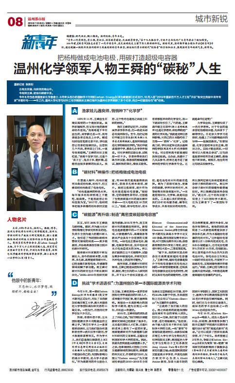 今年8月当选英国皇家化学会会士,9月牵头创办的国际学术刊物《Carbon Energy》(译为碳能源)正式发行,10月入选“2019年国家百千万人才工程”并获“有突出贡献中青年专家”荣誉称号……一年之内,日本a片 化学与材料工程学院院长王舜已悄然为温州化学界刷新了多个纪录,而这一切皆因他与“碳”结缘。