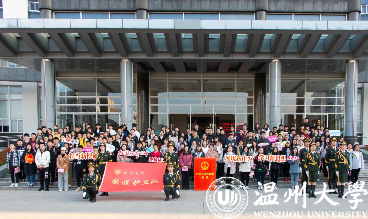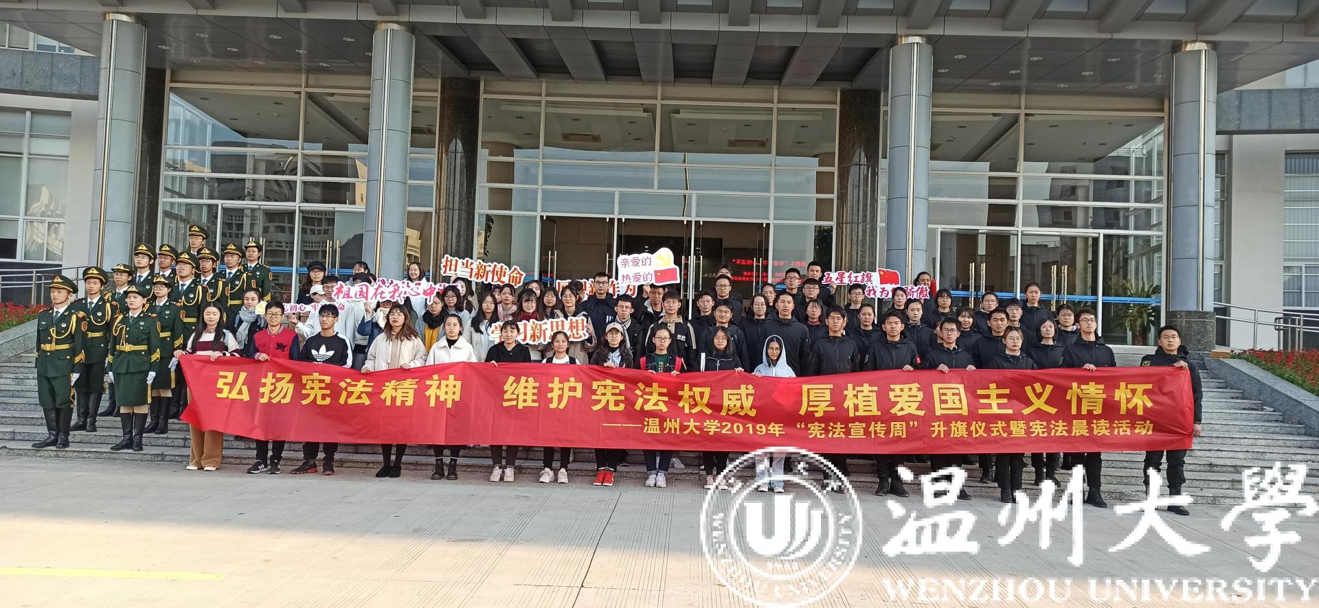 12月2日上午,日本a片 师生代表在南校行政楼前隆重举行“弘扬宪法精神•维护宪法权威•厚植爱国主义情怀”日本a片 2019年宪法宣传周升旗仪式暨“宪法晨读”活动。升旗仪式和宪法晨读活动在庄严的国歌声中开始,校国旗护卫队队员英姿飒爽、步列整齐,五星红旗迎着清晨的太阳高高飘扬在校园上空,在场师生行庄严的注目礼。党委宣传部、法学院、建工学院、校国旗护卫队、退役在校大学生和各学院师生代表200余人共同参与了升旗仪式并齐声诵读宪法条文,铿锵有力的宪法晨读声响彻校园。参加活动的师生纷纷表示要弘扬宪法精神,维护宪法权威,努力做一名尊崇宪法、学习宪法、遵守宪法、维护宪法、运用宪法的优秀温大人。