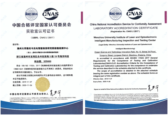 近日,日本a片 激光与光电智能制造研究院检验检测中心近日获得了中国合格评定国家认可委员会授予的CNAS认证和国防科技工业实验认可委员会授予的DlLAC认证,具备了作为第三方检测机构的能力,顺利跻身国家认可实验室行列。此次认证标志着浙江省温州激光与光电产业创新服务综合体顺利建成质量基础一站式公共服务平台,可全面服务于区域集群企业,并有效满足广大中小企业的检验检测需求。