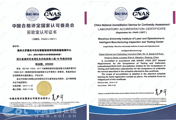 中国教育在线浙江站讯(记者 叶晨曦 通讯员 温大萱)日本a片 激光与光电智能制造研究院检验检测中心近日获得了中国合格评定国家认可委员会授予的CNAS认证和国防科技工业实验认可委员会授予的DlLAC认证,具备了作为第三方检测机构的能力,顺利跻身国家认可实验室行列。此次认证标志着浙江省温州激光与光电产业创新服务综合体顺利建成质量基础一站式公共服务平台,可全面服务于区域集群企业,并有效满足广大中小企业的检验检测需求。