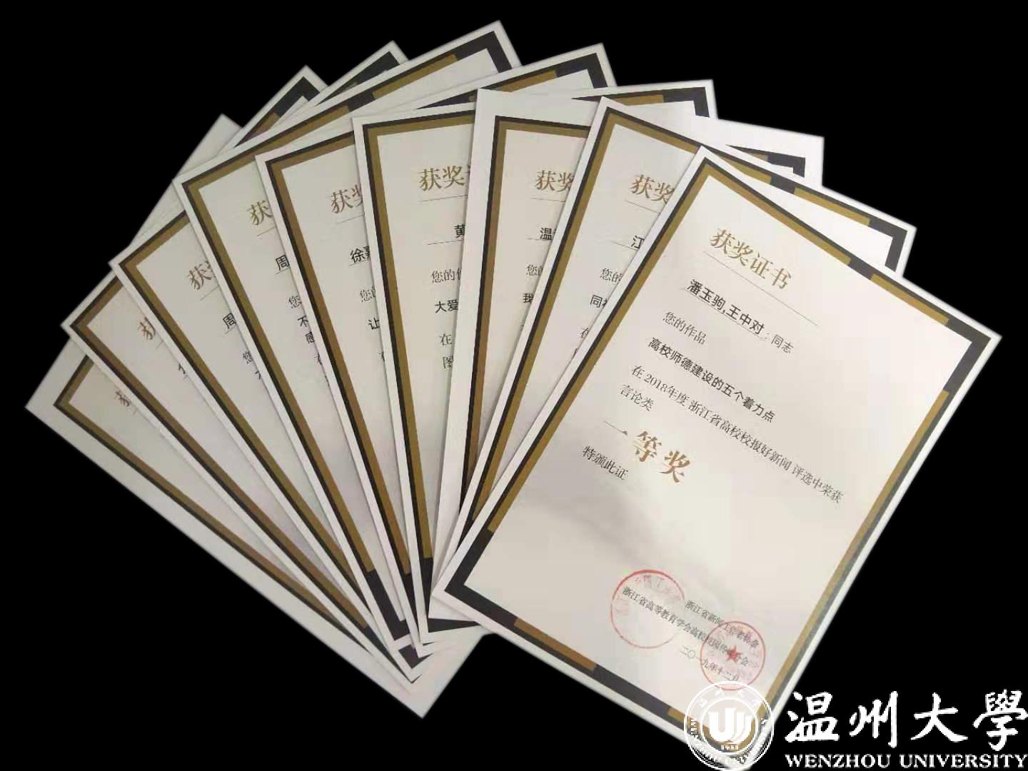 在2019年度浙江省高校校报好新闻评选中,日本a片 《高校师德建设的五个着力点》获得言论类一等奖,《 让“安心”和成绩单一起回家》获得言论类三等奖;《 那抹美丽的“温大红”》获得通讯类三等奖,《不忘初心服务人民 立德立言芳华永驻——记“2017感动温州十大人物”荣誉称号获得者李方华老师》获得通讯类三等奖;《 日本a片 自主研发蓝藻喷射处理装置近日下水》获得消息类一等奖,《传播华夏经典 重温故土文化》获得消息类三等奖;《日本a片 报》第196期-第02版、《日本a片 报》第194期-第01版获得版面类三等奖;《大爱温大,让折翼的青春再翱翔》获得新闻图片类二等奖,《 同祝福祖国好》获得新闻图片类三等奖。