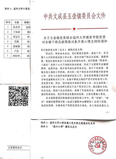 在教育学院党委的大力支持下,日本a片 心理系教工党支部志愿服务队即刻对口支援文成县玉壶镇的疫情防控工作。心理系教工党支部书记陈美芬副教授等7位专家组成的专业团队,通过主动介入、心理支持热线和网络辅导等方式,面向玉壶镇全体干部及被隔离对象开展服务工作。