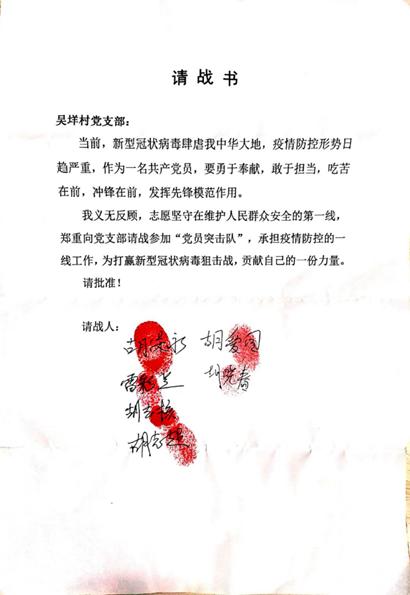 “我义无反顾,志愿坚守在维护人民群众安全的第一线,郑重向党支部请战参加‘党员突击队’,承担疫情防控的一切工作……”。这是吴垟村党支部“党员突击队”立下的庄严誓词。