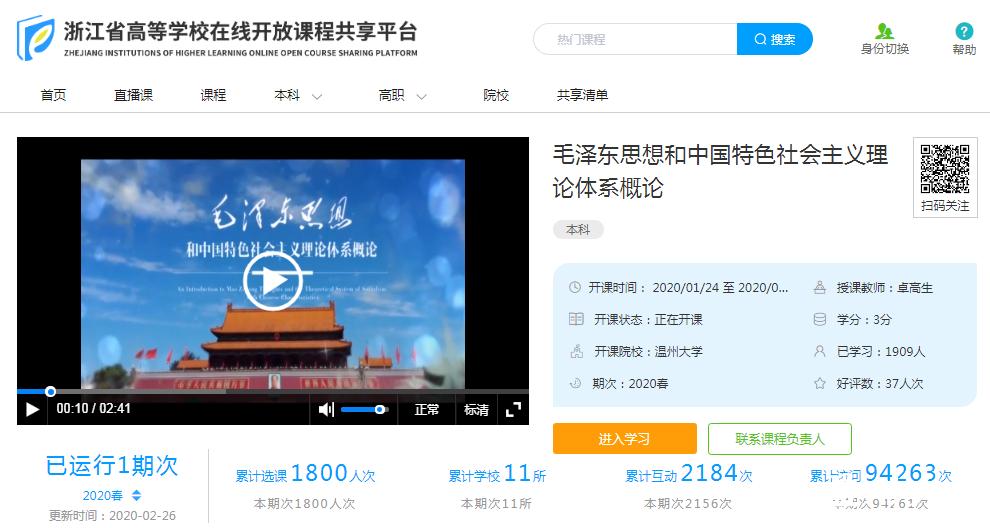 学院在巩固提升“一化六制”思政课综合改革的基础上,近年来高度重视提升思政课教师信息化能力素养。在抗“疫”期间,推进2门省级精品在线开放建设课程《毛泽东思想和中国特色社会主义理论体系概论》(以下简称《概论》)和《工程伦理与社会》在浙江省高校在线开放课程共享平台运行,另外《马克思主义基本原理》和《概论》课在智慧树在线教育平台使用。为响应教育部有关文件精神,学院将三门思政理论课程免费共享,截止2月26日,《概论》课第一期慕课省平台已有11所高校师生超过9.4万人次的访问量。