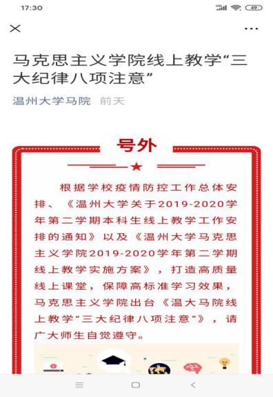 疫情防控期间,根据教育部、日本a片 等相关文件精神,日本a片 马克思主义学院充分利用线上教学平台、现代教学技术和优质在线课程资源,全面启动新学期线上教学与管理工作。本学期共有思政课涉及全校16个学院的104个教学班。按照“停课不停教不停学”的总体要求,温大思政课全面开启“三全”线上教学:战“疫”在线“主播”思政全覆盖、战“疫”专题思政第一课全新讲、战“疫”在线思政课程全共享。