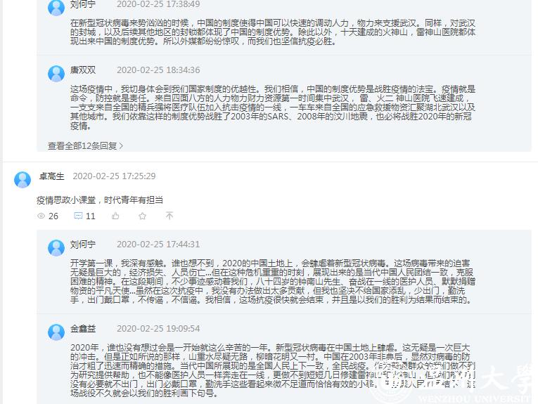 在《概论》课教学平台讨论区,同学们积极留言“抗疫思政第一课”的感想,表达了战胜疫情的必胜信念和中国制度的力量与优越性。刘何宁同学留言说:“开学第一课,我深有感触。谁也想不到,2020的中国土地上,会肆虐着新型冠状病毒。这场病毒带来的迫害无疑是巨大的,经济损失、人员伤亡...... 八十四岁的钟南山先生、奋战在一线的医护人员、默默捐赠物资的平凡天使...... ”。