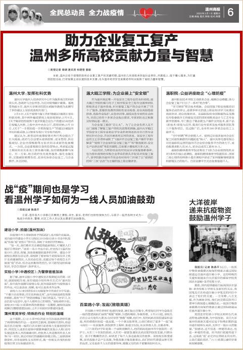 目前,温州正处于疫情防控和企业复工复产的关键时期,温州的几所高校承担起社会责任,开展线上、线下暖心服务,为打赢防控阻击战、打好发展主动仗提供技术支撑,也为温州经济安全发展抢夺时间发挥了高校力量和智慧。