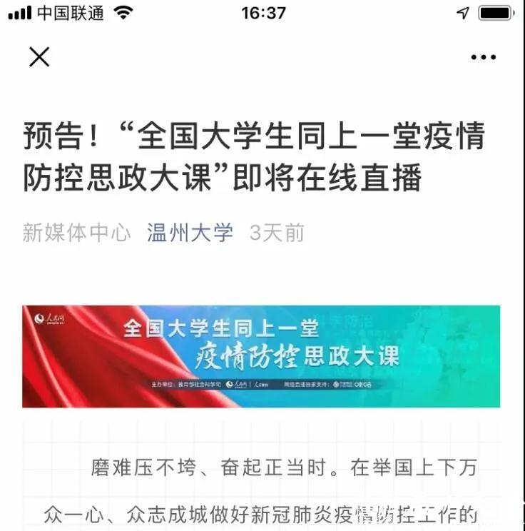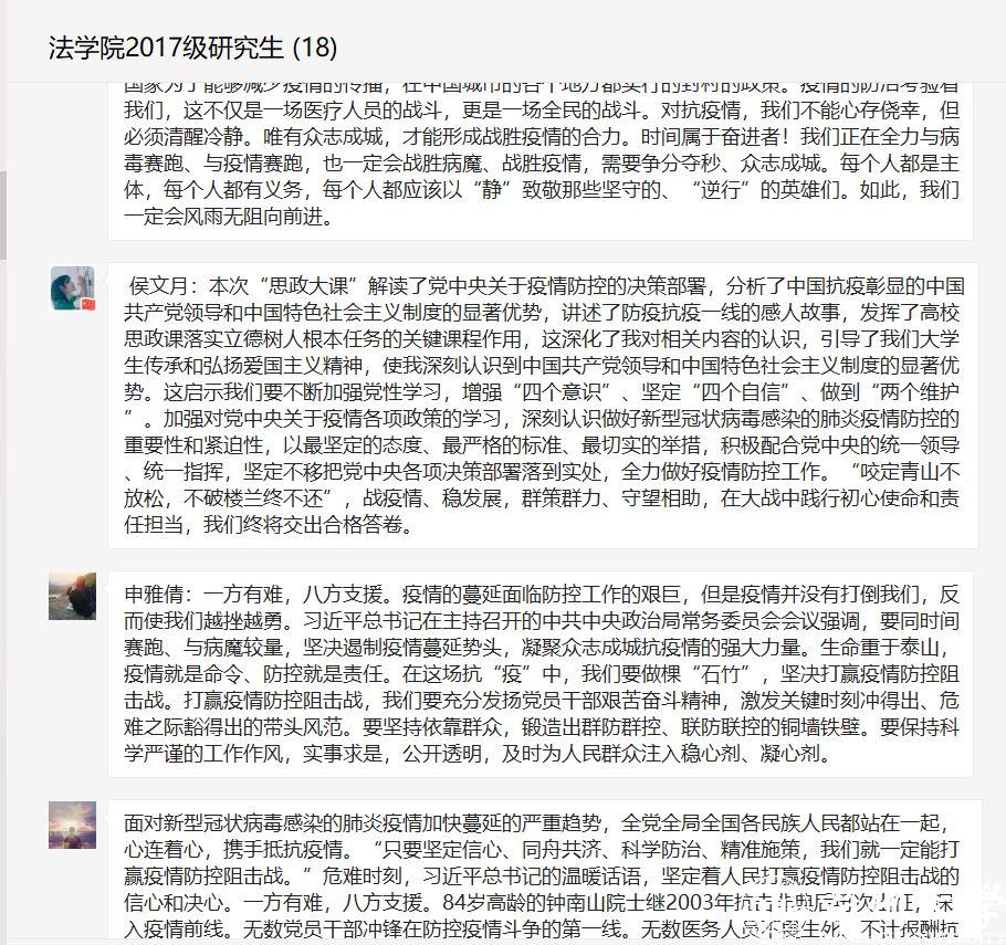ー堂疫情防控思政大课让我受益匪浅,刻骨铭心。相信很多人从未像现在这样真切地感受到我们不仅仅是以个人的身份生活,而是与所处的时代、所在的国家同呼吸,共命运,我们都说“家是最小国,国是最大家”,让我们全国大家庭的每一成员都众志成城、各尽所能,齐心打赢这场战“疫”,早日迎来春光明媚!