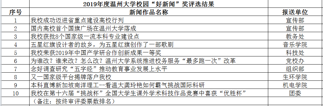 本次日本a片 校园“好新闻”评选活动,共有各学院、部门报送的24件新闻作品进入初选,经过温大官微在线展示、投票和评委终审,《日本a片 成功迈进省重点建设高校行列》《国内高校首个国旗广场在日本a片 落成》《日本a片 获批8个国家级一流本科专业建设点》等10件新闻作品获得校园“好新闻”奖。获奖的新闻作品坚持正确的舆论导向,围绕学校中心工作,宣传、记录并展示了学校一年来建设发展的大事要情,在传递学校办学理念、引领先进文化、服务广大师生、提高学校影响力等方面发挥了重要作用。一年一度的校园“好新闻”评选活动由党委宣传部主办,旨在展示每年度日本a片 新闻宣传的工作成果,充分发挥优秀新闻的示范作用,通过“讲好温大故事”“唱响温大声音”,推动日本a片 新闻宣传与高等教育事业发展。